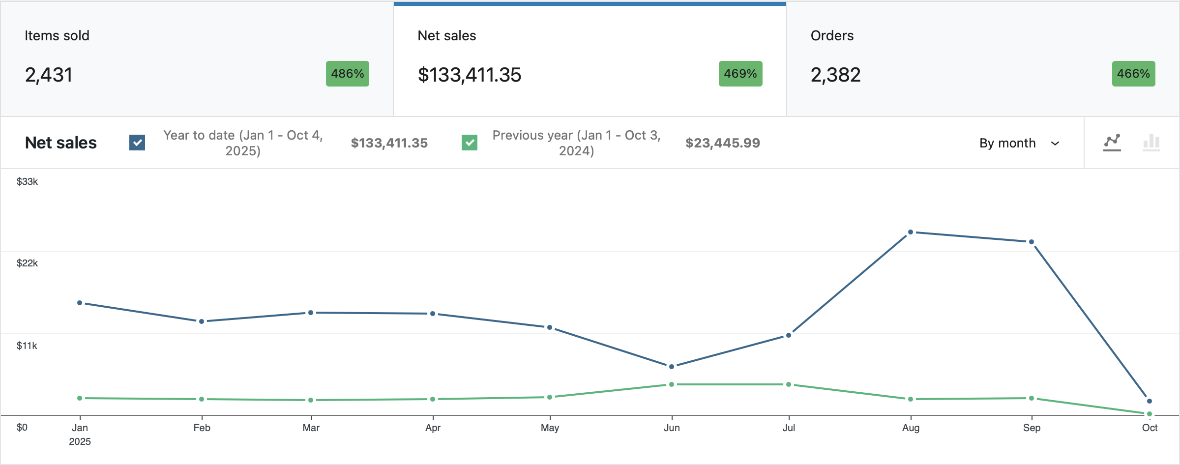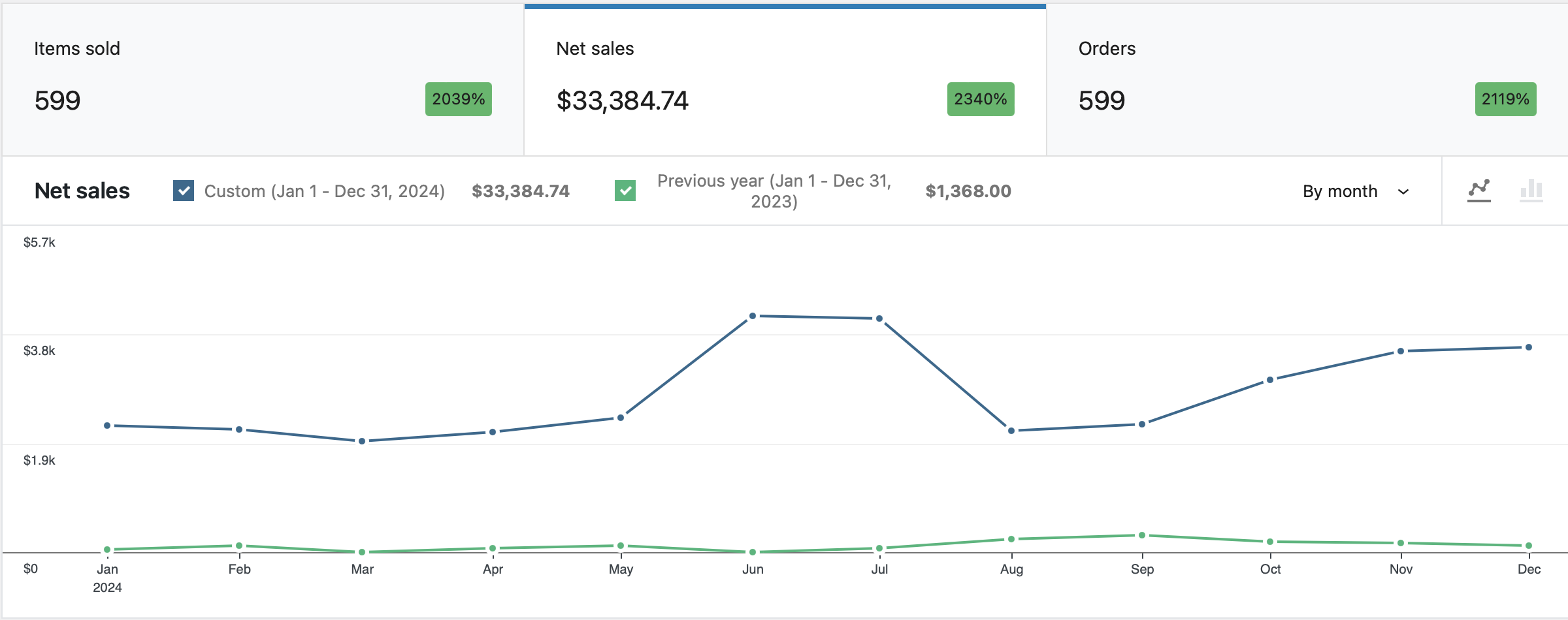 This graph shows the growth in sales after the Mucus Purge rebrand with our assistance. As you can see, in 2023 (pre-partnership) sales were only 1.3k, by the end of 2024 sales rose 2000% to end the year with a 33k net in sales. But there’s more…